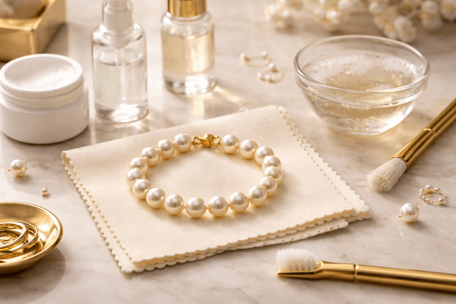 L’or et les perles nécessitent des soins légèrement différents, il faut donc équilibrer les deux. Les perles sont délicates et poreuses : elles absorbent facilement les produits chimiques. Mettez toujours votre bracelet en dernier, après avoir appliqué lotions, parfums et laques. Retirez-le avant de vous laver les mains ou de faire la vaisselle. Les produits chimiques des savons abîment les perles avec le temps.