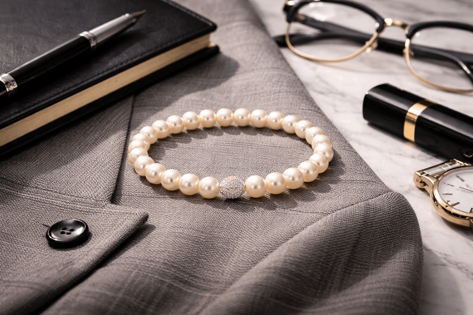 Ils fonctionnent à merveille dans un cadre professionnel quand on veut de l’élégance sans ostentation. Portez-les avec vos tenues de bureau en semaine. Puis remettez le même bracelet avec des vêtements décontractés le week-end. La polyvalence est inégalée. Pour les femmes qui veulent une bracelet de perles ultra-portable, les perles blanches de taille moyenne (7–8 mm) tombent juste. Assez grandes pour être visibles, assez petites pour le quotidien. Vous ne pouvez littéralement pas vous tromper en commençant par du blanc classique si vous constituez votre collection de perles.